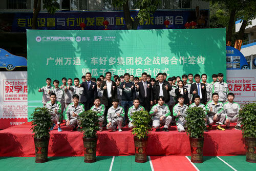 3月初,广州万通·车好多集团校企战略合作签约暨瓜子二手车定向班启动仪式隆重举行!定向班正式开班,这标志着同学们一只脚已经跨进了瓜子二手车的大门!同时岗前培训也正式开启,培训包括公司文化、产品知识等企业背景介绍,促销技巧、普通洗车、机器打蜡、内饰清洁检测和保养换油等项目。