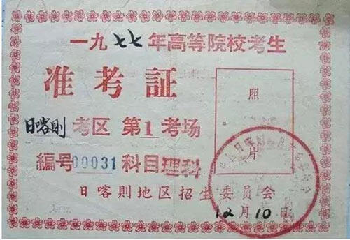 1977年,西藏日喀则地区准考证