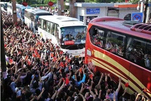 2015年6月5日,安徽六安,被称为“亚洲最大高考工厂”的安徽六安毛坦厂中学近万名高三考生前往市区备战高考,当地民众和高考考生家长过万人前往送考。