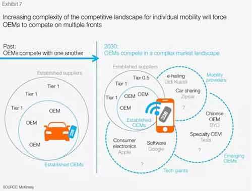 出行行业向服务行业的格局转型,加上新公司的进入,将不可避免地迫使传统的汽车制造商在多个领域展开竞争。出行服务提供者(例如优步)、科技巨头(例如苹果、谷歌)以及特制车厂商(例如特斯拉)增加了竞争格局的复杂性。传统汽车企业处于不断降低成本、提高燃油效率、减少排放、提高资本效率的压力之下,将更加感受到紧迫感,有可能在不断变化的汽车和出行行业转型自身市场定位,从而可能导致现有企业合并或出现新形式的合作关系。