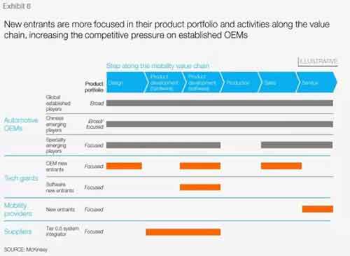市场多样化将为新企业带来机会,他们将首先集中于价值链上的部分环节,只针对特定的、有盈利空间的细分市场,然后再进行拓展。尽管特斯拉、谷歌和苹果目前展现了极大的兴趣,我们认为他们所代表的仅是冰山一角。还有更多的新企业将可能进入市场,特别是现金充裕的高科技公司和初创企业。这些从行业外新进入的公司也掌握着对消费者和监管机构更大的影响力(即激起对全新出行形式的兴趣,游说对新技术的有利监管措施)。类似地,一些最近拥有骄人销售增长的中国汽车制造商,可能利用目前的行业洗牌在全球范围扮演重要角色。