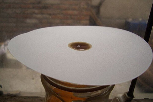 滤纸使用方法:停车十分钟后,抽出机油尺,滴一滴机油在滤纸中心位置,然后将试纸平放在中部空心的物体上(比如杯子或碗口),等待5到8小时后观察机油在试纸上留下的油斑。其中,油斑从外到里分为油环、扩散环、沉积环三层。油环越宽说明机油氧化越小;扩散环越宽说明机油剩余寿命越长;沉积环颜色越浅说明机油中杂质越少。