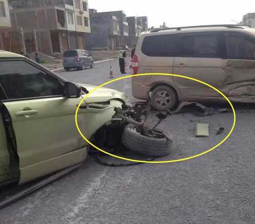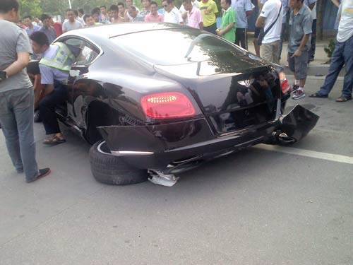 在某十字路口五菱和宾利发生严重交通事故,五菱一方前脸受损,而大宾利整个后轴完全被撞断,其中一个轮子还不知道飞到哪里去了…