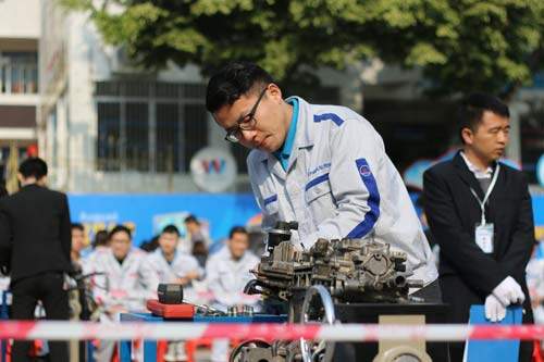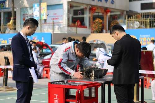 在手动变速器拆装项目比赛上,参赛同学用规范的操作、标准的动作引得评委连连点头,得分肯定不低