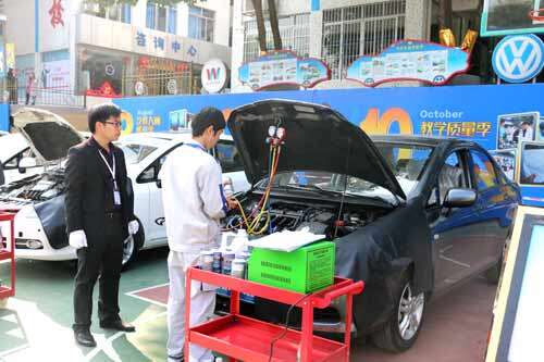 在空调雪种的加注项目比赛上,参赛同学正在加注制冷剂,在专注作业的同时也不忘保持操作台面工具的有序摆放