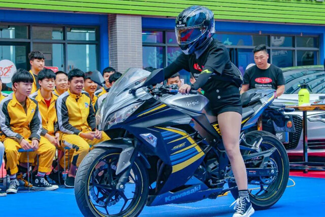 活动现场,一名企业贴膜的女技师,骑着川崎机车炫酷登场,瞬间点燃现场气氛,受到同学们的热烈欢迎。