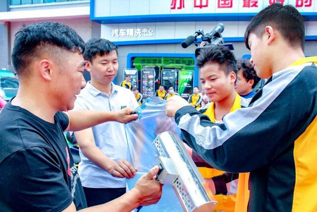 秀酷车影的技师小雨,一身黑色工作服,摘下头盔的一刹那,帅气十足。随后,便现场进行改色膜技术展示,尺寸测量、裁膜、烤膜、贴膜···整个流程一气呵成,同学们赞叹连连。
